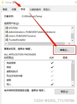 2、右键单击Temp文件夹,选择“属性”打开Temp属性窗口,然后选择“安全”单击“编辑”。