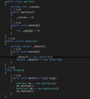 再来看值类型。《C#语言规范》上的措辞是“结构体不要求在堆上分配内存(However, unlike classes, structs are value types and do not require heap allocation)”而不是“结构体在栈上分配内存”。这不免容易让人感到困惑:值类型究竟部署在什么地方?