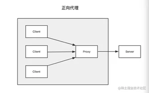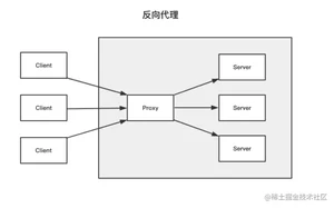 nginx 就是充当图中的 proxy。左边的3个 client 在请求时向 nginx 获取内容,server 是感受不到3台 client 存在的。