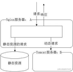 静态请求直接从 nginx 服务器所设定的根目录路径去取对应的资源,动态请求转发给真实的后台(前面所说的应用服务器,如图中的Tomcat)去处理。