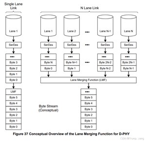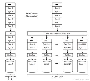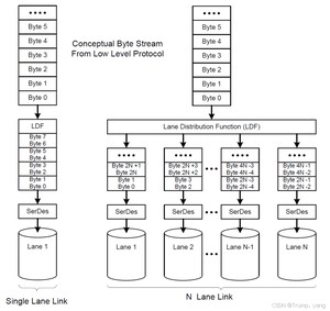 多通道分布指的是将数据流分割成多个数据通道(Data Lanes)进行并行传输,以提高整体数据传输速率。每个数据通道独立传输一部分数据,从而实现更高的传输带宽。如下图所示,使用LDF(Lane Distribution Function)来讲完整码流分成多通道来传输数据
