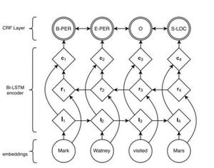 随着深度学习的兴起,也出现了基于神经网络的分词器,例如有人员尝试使用双向LSTM+CRF实现分词器,其本质上是序列标注,所以有通用性,命名实体识别等都可以使用该模型,据报道其分词器字符准确率可高达97.5%。算法框架的思路与论文《Neural Architectures for Named Entity Recognition》类似,利用该框架可以实现中文分词,如下图所示: