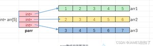 parr[i]是访问parr数组的元素,parr[i]找到的数组元素指向了整型⼀维数组,parr[i][j]就是整型⼀维数 组中的元素。 上述的代码模拟出⼆维数组的效果,实际上并⾮完全是⼆维数组,因为每⼀⾏并⾮是连续的。