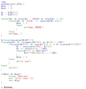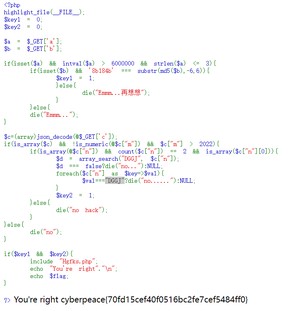 先看$key1,在第一个if里面,通过GET上传a和b的值来使$key1=1,要求的条件为:a是长度为3的整数,且a要大于以及b的MD5加密值的后六位为8b184b。