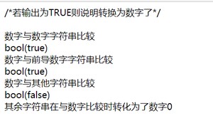 总结下来就是,数字与字符串进行弱类型比较时,会将字符串转化为数字。当字符串为数字字符串或者前导数字字符串时,会转化为相应数值的数字,当为普通字符串时会转化为0(数字0);字符串与字符串的比较规则为从左往右将字符进行比较,若要相等则所有字符得相等,若要比较大小,以第一个不相等的字符比较结果作为字符串大小结果。另外true和任何比较都能满足。