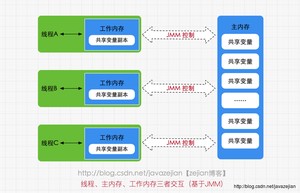 Java内存模型(即Java Memory Model,简称JMM)本身是一种抽象的概念,并不真实存在,它描述的是一组规则或规范,通过这组规范定义了程序中各个变量(包括实例字段,静态字段和构成数组对象的元素)的访问方式。由于JVM运行程序的实体是线程,而每个线程创建时JVM都会为其创建一个工作内存(有些地方称为栈空间),用于存储线程私有的数据,而Java内存模型中规定所有变量都存储在主内存,主内存是共享内存区域,所有线程都可以访问,但线程对变量的操作(读取赋值等)必须在工作内存中进行,首先要将变量从主内存拷贝的自己的工作内存空间,然后对变量进行操作,操作完成后再将变量写回主内存,不能直接操作主内存中的变量,工作内存中存储着主内存中的变量副本拷贝,前面说过,工作内存是每个线程的私有数据区域,因此不同的线程间无法访问对方的工作内存,线程间的通信(传值)必须通过主内存来完成,其简要访问过程如下图