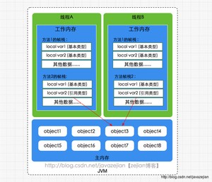 弄清楚主内存和工作内存后,接了解一下主内存与工作内存的数据存储类型以及操作方式,根据虚拟机规范,对于一个实例对象中的成员方法而言,如果方法中包含本地变量是基本数据类型(boolean,byte,short,char,int,long,float,double),将直接存储在工作内存的帧栈结构中,但倘若本地变量是引用类型,那么该变量的引用会存储在功能内存的帧栈中,而对象实例将存储在主内存(共享数据区域,堆)中。但对于实例对象的成员变量,不管它是基本数据类型或者包装类型(Integer、Double等)还是引用类型,都会被存储到堆区。至于static变量以及类本身相关信息将会存储在主内存中。需要注意的是,在主内存中的实例对象可以被多线程共享,倘若两个线程同时调用了同一个对象的同一个方法,那么两条线程会将要操作的数据拷贝一份到自己的工作内存中,执行完成操作后才刷新到主内存,简单示意图如下所示: