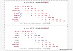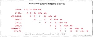 上述便是汇编指令的执行过程,在某些指令上存在X的标志,X代表中断的含义,也就是只要有X的地方就会导致指令流水线技术停顿,同时也会影响后续指令的执行,可能需要经过1个或几个指令周期才可能恢复正常,那为什么停顿呢?这是因为部分数据还没准备好,如执行ADD指令时,需要使用到前面指令的数据R1,R2,而此时R2的MEM操作没有完成,即未拷贝到存储器中,这样加法计算就无法进行,必须等到MEM操作完成后才能执行,也就因此而停顿了,其他指令也是类似的情况。前面阐述过,停顿会造成CPU性能下降,因此我们应该想办法消除这些停顿,这时就需要使用到指令重排了,如下图,既然ADD指令需要等待,那我们就利用等待的时间做些别的事情,如把 和 移动到前面执行,毕竟 和 执行并没有数据依赖关系,对他们有数据依赖关系的指令在R4,R5加载完成后才执行的,没有影响,过程如下: