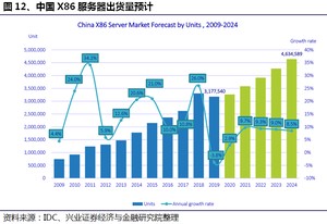 中国x86服务器市场需求有望拐点向上。在中国“新基建”政策的推动下,未来5年,中国X86服务器市场景气度有望提升。根据IDC的预测,2020-2024年,中国X86服务器的出货量复合增长率为9.1%。