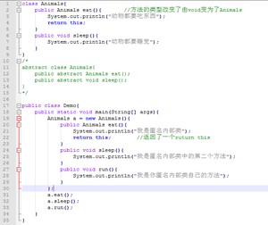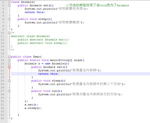 显然是不行的,所以Endeavor觉得内名内部类可以有自己特有的方法,但是前提条件是这个匿名内部类只有这一个方法。如果有多个方法的时候,他只能继承父类的方法以及重写这个方法或实现接口,绝不可能在在多个方法的情况下,调用自身特有的方法,但是这个特有的方法可以存在,但无法调用,不知道大家认同与否。