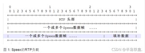 Speex的RTP负载如图1所示。本格式没有附加的头部,所以只什用标准的RTP头部 头部之后是一个或多个负载数据库(speex帧)。包尾部可能需要一些填补数据。