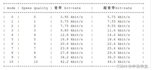 mode: 以逗号分隔的多个speex支持的解码模式,按优先度排列。第一个具有最优先级,剩余的依次排列。对于窄带和宽带可用的模式值不一样,见以下定义: