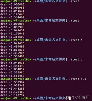 这是网上找的介绍,看了还是不知道说什么,我们会通过代码来看一下,就理解了。drand48()函数会产生0-1之间的随机数,而且是float型的,但是它的随机种子也是固定的,对于同一个操作系统,而srand48就是改变它的随机种子的,我们这里随机种子是选用的输入的数字作为它的随机种子,每次输入的数字不一样,它的随机种子不一样,最后产生的随机数也就不一样,可以看下面的代码运行结果,就能够理解了。