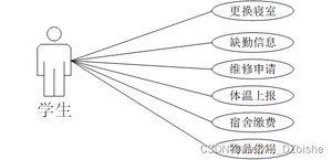 学生前台进入系统可以进行首页、宿更换寝室。缺勤信息、维修申请、体温上报、宿舍缴费、物品借用等。用户前台用例如图3-8所示。