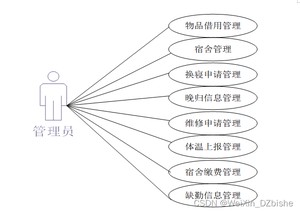 系统中的核心用户是系统管理员,管理员登录后,通过管理员菜单来管理后台系统。主要功能有:首页、用户管理、宿舍信息管理、换寝申请管理、物品借用管理、晚归信息管理、体温上报管理、维修申请管理等功能。管理员用例如图3-7所示。