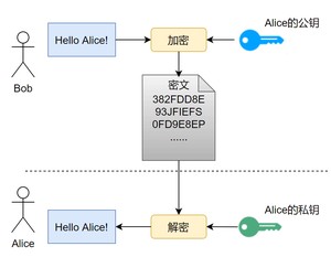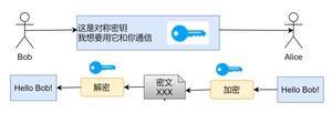在对称加密中,发送方与接收方使用相同的秘钥。那么在非对称加密中则是发送方与接收方使用的不同的秘钥。其主要解决的问题是防止在秘钥协商的过程中发生泄漏。比如在对称加密中,小蓝将需要发送的消息加密,然后告诉你密码是 123balala,ok,对于其他人而言,很容易就能劫持到密码是 123balala。那么在非对称的情况下,小蓝告诉所有人密码是 123balala,对于中间人而言,拿到也没用,因为没有私钥。所以,非对称密钥其实主要解决了密钥分发的难题。如下图
