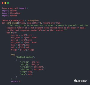 - prn : scapy 通过这个函数来操作所有符合 规则的数据包。上面的例子只是将数据包打印到终端,下文将会修改函数来伪造重置报文。