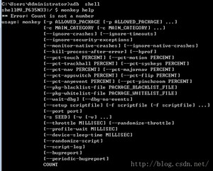 当我们运行Monkey测试时,命令发出之后,手机便开始执行monkey命令了。Monkey命令具体用法如下图所示: