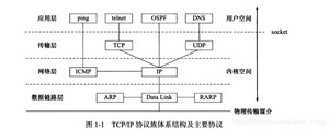 数据链路层、网络层和传输层负责处理网络通信细节,这部分必须既稳定又高效,因此它们都是在内核空间实现的;而应用层负责处理众多逻辑,比如文件传输、名称查询和网络管理等,因此是在用户空间实现。(有少数服务器程序是在内核中实现的,这样代码就无须在用户空间和内核空间来回切换(主要是数据的复制),极大地提高了工作效率,不过这种代码实现比较复杂,不够灵活,且不便移植)
