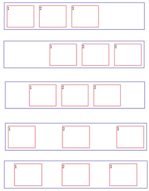 分别表示:左对齐 | 右对齐 | 居中 | 两端对齐 | 每个项目两侧的间隔相等。以下是对应的效果: