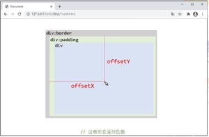 offsetX/Y获取到是触发点相对被触发dom的左上角距离,不过左上角基准点在不同浏览器中有区别,以内容区左上角为基准点(不包括边框),如果触发点在边框上会返回负值,