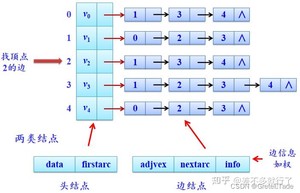前面我们学习过了邻接表是由两种节点组成的,分别是头结点和边节点,头结点是用来储存数据的,而变节点是用来储存于当前节点有通路的节点的引索。如图所示