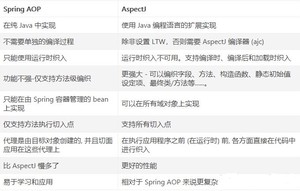 下表总结了 Spring AOP 和 AspectJ 之间的关键区别: