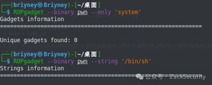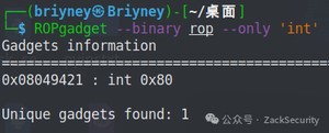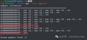 而我们如何控制这些寄存器的值呢?这里就需要使用gadgets。比如说,现在栈顶是10,那么如果此时执行了pop eax,那么现在eax的值就为10。但是我们并不能期待有一段连续的代码可以理想控制对应的寄存器,所以我们需要一段一段控制,这里需要用到ROPgadget工具寻找gadget。