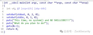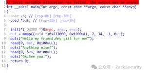 而且mmap指定了buf的起始地址为0x,因此可以利用第一个read向buff中写入shellcode,再通过第二个read进行栈溢出,将返回地址覆盖为0x,最后编写exp运行获取shell。