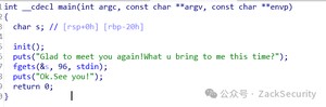 阅读代码发现程序调用了gets函数,gets本身是一个危险函数,它不会对字符串的长度进行校验,而是以回车判断输入是否结束,存在栈溢出漏洞,shift+f12发现程序中有可执行后门system(“/bin/sh”):
