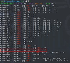 先找到控制eax的gadget,这几个都可以控制eax,这里使用第二个。再找控制ebx的gadget: