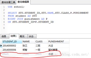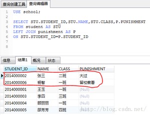 分析一下执行结果,LEFT JOIN操作中,比如A LEFT JOIN B,会输出左表A中所有的数据,同时将符合ON条件的右表B中搜索出来的结果合并到左表A表中,如果A表中存在而在B表中不存在,则结果集中会将查询的B表字段值(如此处的P.PUNISHMENT字段)设置为NULL。所以,LEFT JOIN的作用是: