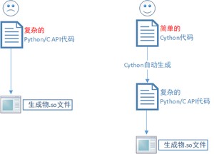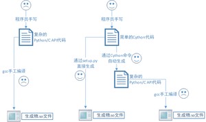 - 第一条线是用Python/C API,有2个哭脸,不但代码写起来烦人,编译构建也烦人,所以我们才用Cython取代Python/C API;
