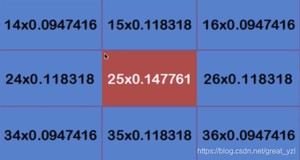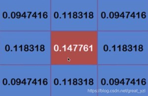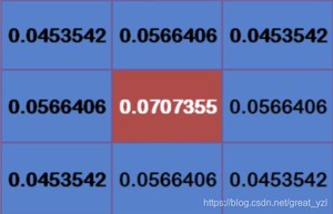 这9个点的权重总和等于0.,如果只计算这9个点的加权平均,还必须让它们的权重之和等于1,因此上面9个值还要分别除以0.,得到最终的权重矩阵。