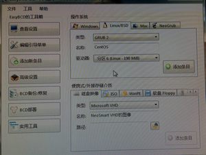 分区完成,后续的选择就真的是傻瓜式了,自己摸索吧,这样系统就安装完成了,重启,嚓哩,怎么开机依然是windows系统那一套,开机完成依然是windows7那古板的桌面,就像压根没装LINUX似的!!!不着急,看看磁盘管理里面有没有两个磁盘,第二个磁盘有没有你分区的痕迹,都有的话那就说明你装上了,这是PC还没有找到你Linux的开机引导程序,这里我就不贴图了,因为我的第二个磁盘肯定显示不了,别忘了,流氓的VRV会禁掉我第二个磁盘的驱动(无奈中。。。)不过不影响大局,我的/boot安装在硬盘A中,有/boot就可以了,现在要解决的问题就是怎样将Windows的开机引导分区与Linux的开机引导分区联系起来,通过更改内部程序我是搞不了了,不过无碍,有专门的软件来解决这个问题,那就是EasyBCD,下载完成EasyBCD并打开,“添加新条目”-->"Linux/BSD" 类型选择GRUB 2 ,名称随便选择一个(开机时的显示名称),驱动器选择/boot所在的分区,这个千万不能选错,不然开机就引导不了了!!! 最后选择“添加条目” 大功告成,重启验收成果!