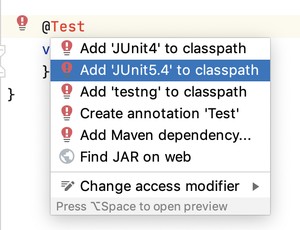 如果你是第一次使用我的话,IDEA 会提示你导入我的依赖包。建议你选择最新的 JUnit 5.4。