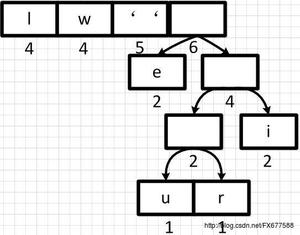 首先我们从左到右进行合并,依次构建二叉树。第一步取前两个字符u和r来构造初始二叉树,第一个字符作为左节点,第二个元素作为右节点,然后两个元素相加作为新空元素,并且两者权重相加作为新元素的权重。
