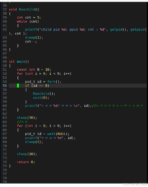 上面的代码就是先创建一个子进程, 然后子进程5s后变成僵尸进程被等待, 父进程10后运行等待, 然后关闭子进程。 但是这个程序很难观察到wait的作用,我们修改一下: