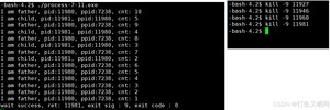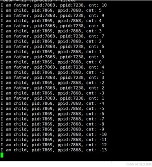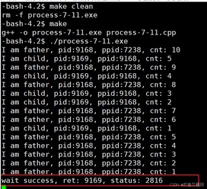 运行结果如下,可以发现, 其实子进程没有进入僵尸, 那么父进程的等待对不它不起效果。——这个其实就是父进程在wait这里发生了阻塞等待!!也就是说, 父进程不会退出, 一直等待子进程的返回。