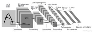 接下来构建LeNet模型。LeNet的网络结构如下图所示,一共7层。其中C1,C3,C5为卷积层,S2,S4为降采样层,F6为全连接层,还有一个输出层。网络结构比较简单,这里不进行具体分析,想要了解的可自行查找。