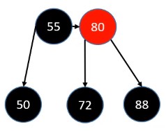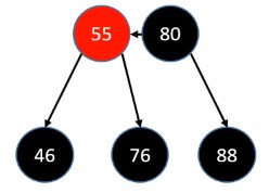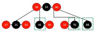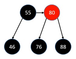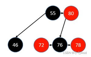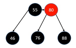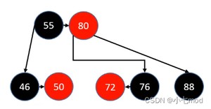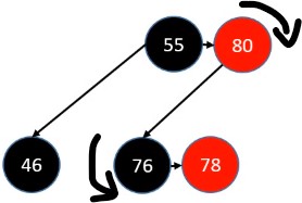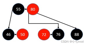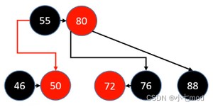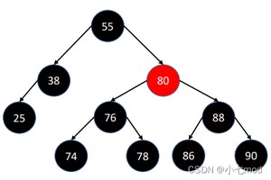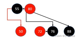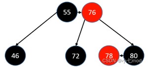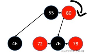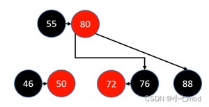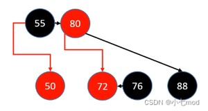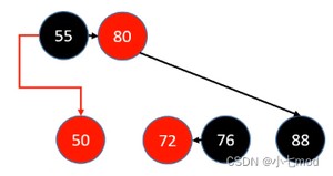 删除88节点之前,需要先转换成兄弟节点为黑色的情况,当前88的兄弟节点是红色55。可以将其看作LL情况,对父节点88进行右旋转,这样55就被移动上去了,成了80的父节点。76也被移动上去了,成了80的子节点。