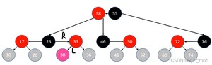 B树节点中的中间节点大小介于两个子节点之间。以上图RR情况为例,插入节点52的原父节点应该放在B树节点中间的位置,应当将其染成黑色。插入节点52的原祖父节点46,应当将其转换为插入节点原父节点的子节点,所以将其染成红色。LL情况同理