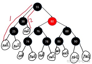 这样一来,路径1有4个黑色节点(算上空节点),路径2只有3个黑色节点,这样性质5就不满足了,所以这棵树并不是一个红黑树节点。
