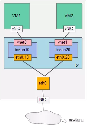 Bridge 本身是支持 VLAN 功能的,如下图所示,通过配置,Bridge 可以将一个物理网卡设备 eth0 划分成两个子设备 eth0.10,eth0.20,分别挂到 Bridge 虚拟出的两个 VLAN 上,VLAN id 分别为 VLAN 10 和 VLAN 20。同样,两个 VM 的虚拟网卡设备 vnet0 和 vnet 1 也分别挂到相应的 VLAN 上。这样配好的最终效果就是 VM1 不能和 VM2 通信了,达到了隔离。