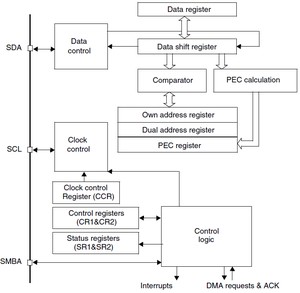 如左图所示,为STM32的I2C外设模块结构图。它对外有三个引脚SCL、SDA和SMBA,其中SCL和SDA分别是I2C总线的时钟和数据信号线, SMBA则是一种基于I2C总线协议的SMBus(System Management Bus)的Alert引脚。这里我们不研究SMBus是个什么鬼。