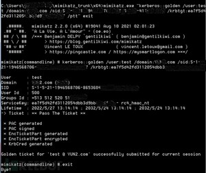 然后更据获取的Hash值,伪造出黄金票据,从而使用下图命令进行攻击;发现攻击成功!