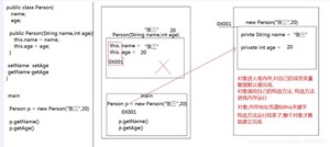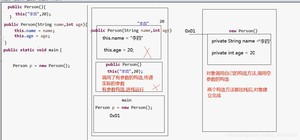 main函数进栈,Person p = new Person("张三",20);进入堆内存,并为其成员变量初始化为空, Person对象调用自己的构造方法,构造方法进栈内存运行。