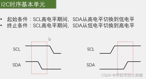 在SDA下降沿之后,主机会让SCL变成低电平,一方面是占用这个总线,另一方面是为了进行拼接。因为除了起始和终止条件,每个时序单元的SCL都是低电平开始低电平结束。