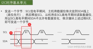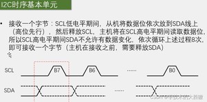 起始条件之后第一个字节必须是主机发送的,在SCL低电平时,主机如果想发送0就拉低电平,想发送1就拉高电平。在这一位放好之后,主机松手时钟线,SCL回弹到高电平,在高电平期间是从机读取SDA的时候,所以SCL高电平期间不允许改变SDA电平,这也是SCL高电平SDA下降沿作为起始条件的原因,因为发送数据过程中SCL高电平的话SDA肯定不会改变。
