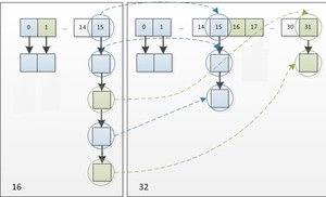 因此,我们在扩充HashMap的时候,不需要重新计算hash,只需要看看原来hash值新增的那个bit是1还是0就可以了,是0的话索引没变,是1的话索引变成“原索引+oldCap(原位置+旧容量)”。这里不再详细赘述,可以看看下图为16扩充为32的resize示意图: